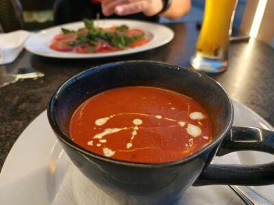 Am Sonntagabend hatten wir dann endlich Glück und ergatterten einen Platz auf der Terrasse – direkt an der Promenade, mit freiem Blick auf Strand und Meer. Eine traumhafte Kulisse für den Abschluss unserer Reise. Kulinarisch war es ein Volltreffer: Zur Vorspeise gab es eine Crema di Pomodoro, die wunderbar aromatisch schmeckte. Danach folgten hausgemachte Nudeln mit einer klassischen Tomatensoße, schlicht, aber perfekt zubereitet. Dazu ein Aperitif vorab – das volle Programm, rund und stimmig.