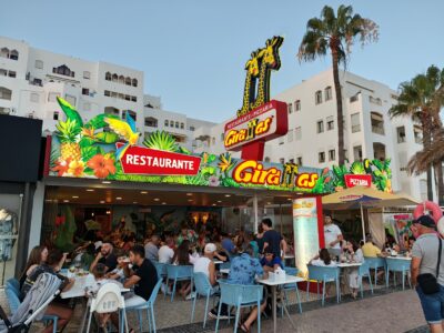 Am Abend kehrten wir im Giraffas ein – offenbar eines der beliebtesten Restaurants in Quarteira, denn es war rappelvoll. Wir hatten Glück: Gerade als wir ankamen, wurde ein Tisch frei, und wir konnten uns direkt niederlassen. Das Ambiente war bunt und lebendig, begleitet von Live-Musik, die den Abend zusätzlich aufwertete. Auf der Karte stand unter anderem ein „Hähnchen-Kebab“. Da ich mir nicht sicher war, fragte ich nach – und bekam prompt die Empfehlung mit Reis und Pommes. Serviert wurde am Ende eine riesige Portion: zartes Hähnchenfleisch, dazu Pommes, Reis und frischer Salat. Geschmacklich top, preislich mit rund 16 Euro absolut fair.