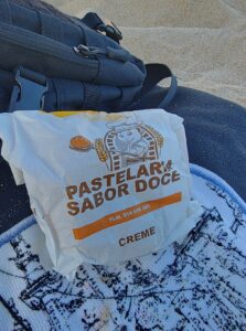 Dabei kam ich nicht an einer dieser typischen Strandleckereien vorbei: Bolas de Berlim. Die Verkäufer:innen ziehen mit großen Kisten durch die Reihen und bieten die prall gefüllten Krapfen an – außen knusprig, innen weich und herrlich süß. Für 2 Euro gab es eine mit Vanillecreme, später probierte ich auch eine mit Kinder-Bueno-Füllung. Absolut sündig, aber genauso absolut lecker – und perfekt, um sich nach der frischen Atlantikbrise noch etwas Sonne und Zucker zu gönnen.