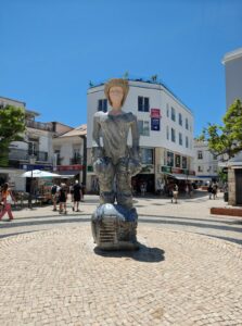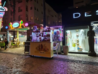 Am Abend zog es uns an die Promenade von Quarteira – und die zeigte sich gleich von ihrer besten Seite. Entlang der breiten Uferpromenade reihen sich Restaurants, Eisdielen, kleine Boutiquen und Souvenirläden aneinander, dazwischen immer wieder Bänke mit Blick aufs Meer. Die Palmen entlang der Promenade waren dezent beleuchtet, und es lag diese besondere Mischung aus Meeresluft und Sommerabend in der Luft. Zwischen Gitarrenklängen, einem kleinen Marionettentheater und spontanen Auftritten lokaler Straßenkünstler entstand eine Atmosphäre, die lebendig und zugleich entspannt wirkte. Quarteira ist bekannt dafür, eher von portugiesischen Familien und Stammgästen besucht zu werden als von klassischem Partytourismus – und genau das merkt man: Es ist international, aber unaufgeregt.