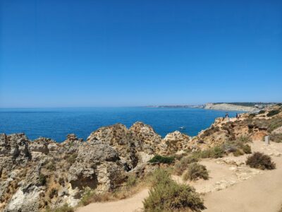 Vom Aussichtspunkt oben eröffnet sich ein grandioser Blick über die Küstenlinie, der an klaren Tagen bis nach Sagres reicht. Besonders beeindruckend ist das Farbspiel: das tiefe Blau des Ozeans, das warme Ocker und Gelb der Felsen und das strahlende Weiß der Gischt, die an den Klippen zerbricht. Mehrere Treppen und schmale Pfade führen hinab, sodass man die Formationen auch aus nächster Nähe bestaunen kann – die Perspektive von unten ist noch einmal eine ganz andere und macht deutlich, wie mächtig die Natur hier gewirkt hat.