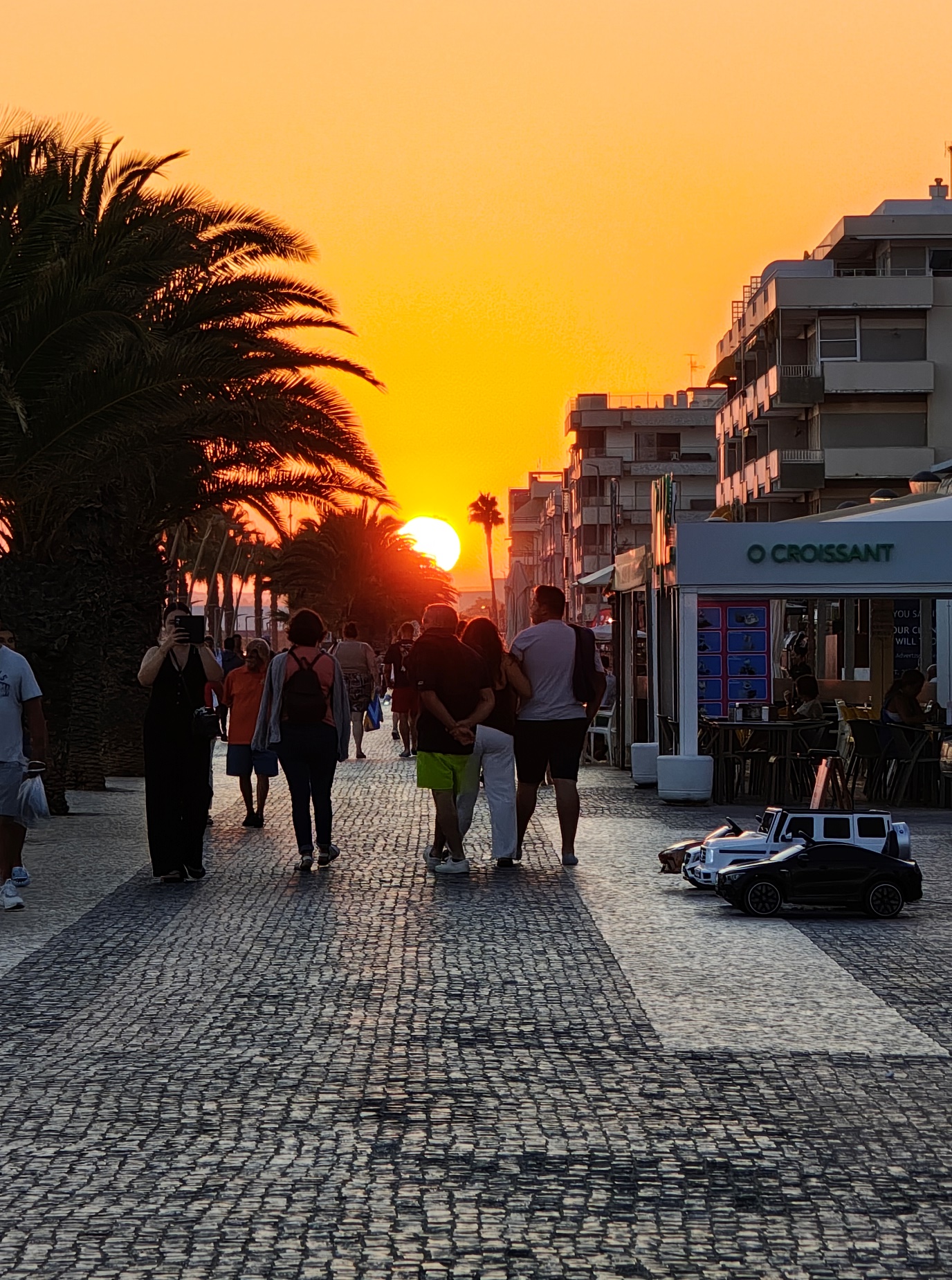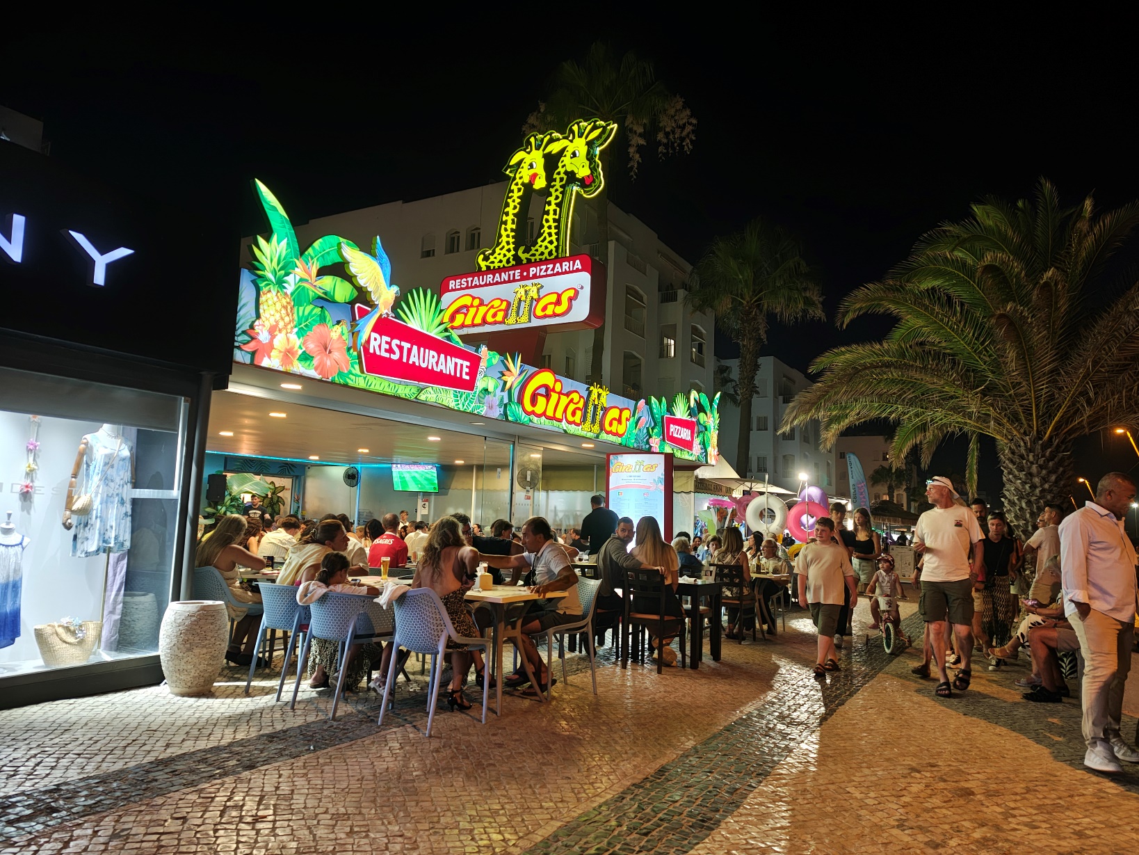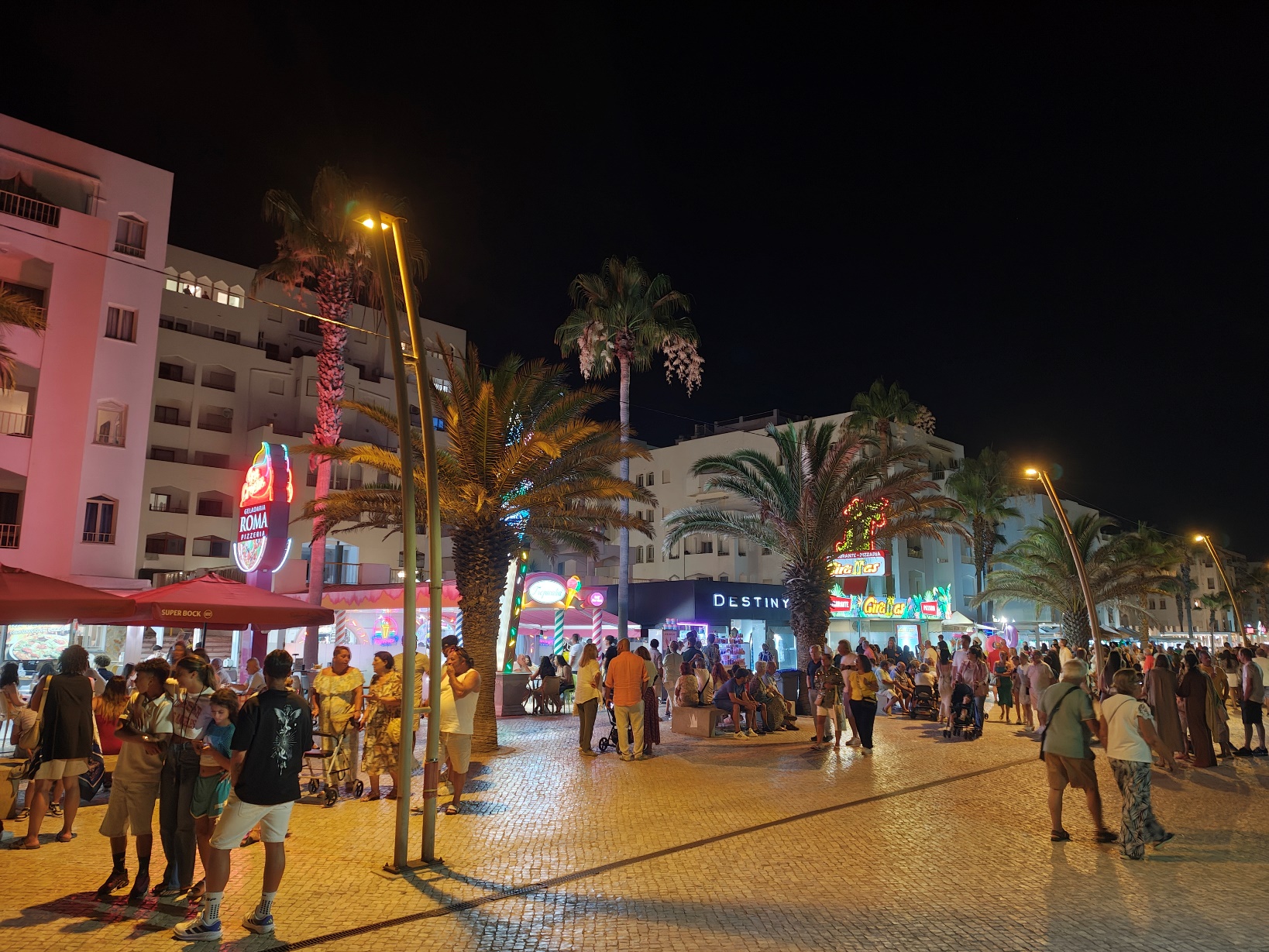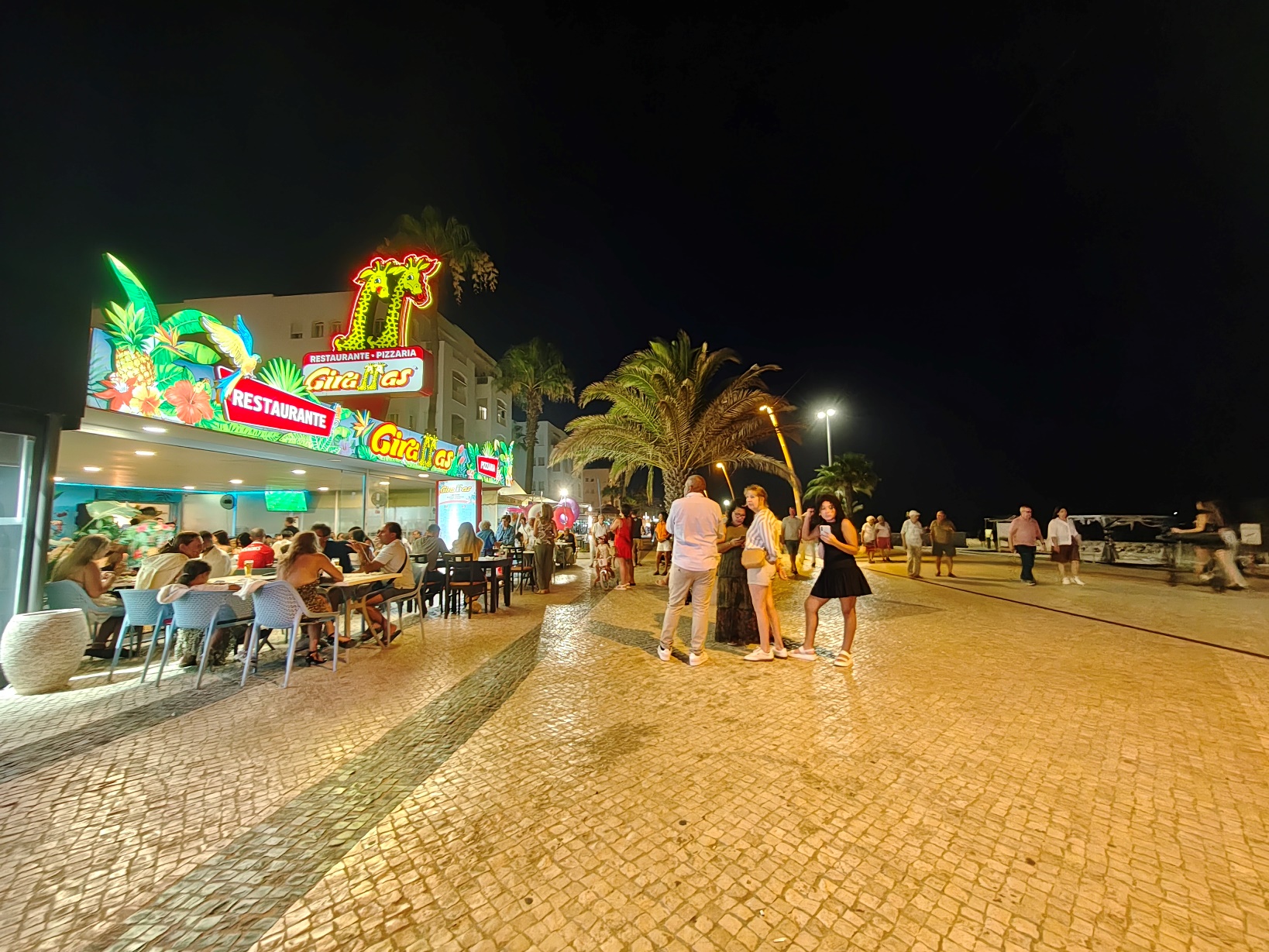 Am Abend zog es uns an die Promenade von Quarteira – und die zeigte sich gleich von ihrer besten Seite. Entlang der breiten Uferpromenade reihen sich Restaurants, Eisdielen, kleine Boutiquen und Souvenirläden aneinander, dazwischen immer wieder Bänke mit Blick aufs Meer. Die Palmen entlang der Promenade waren dezent beleuchtet, und es lag diese besondere Mischung aus Meeresluft und Sommerabend in der Luft. Zwischen Gitarrenklängen, einem kleinen Marionettentheater und spontanen Auftritten lokaler Straßenkünstler entstand eine Atmosphäre, die lebendig und zugleich entspannt wirkte. Quarteira ist bekannt dafür, eher von portugiesischen Familien und Stammgästen besucht zu werden als von klassischem Partytourismus – und genau das merkt man: Es ist international, aber unaufgeregt.