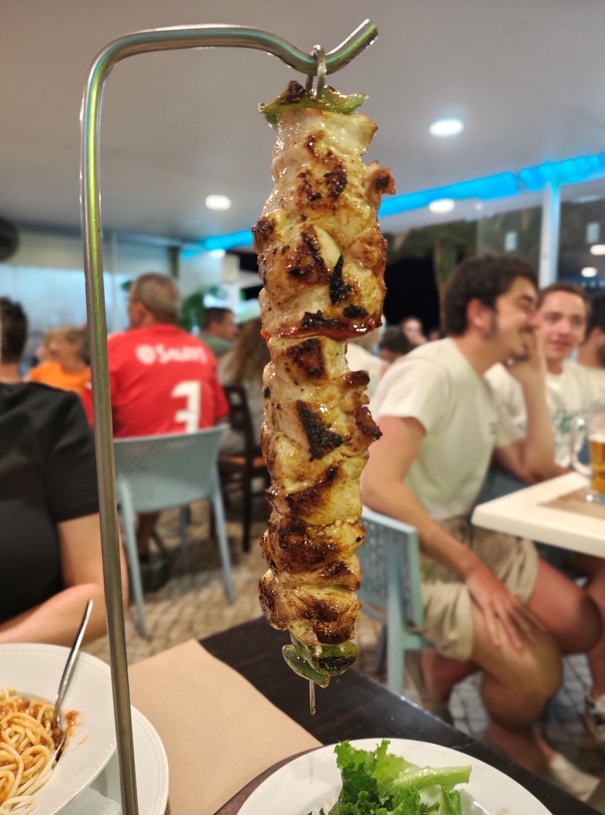 Am Abend kehrten wir im Giraffas ein – offenbar eines der beliebtesten Restaurants in Quarteira, denn es war rappelvoll. Wir hatten Glück: Gerade als wir ankamen, wurde ein Tisch frei, und wir konnten uns direkt niederlassen. Das Ambiente war bunt und lebendig, begleitet von Live-Musik, die den Abend zusätzlich aufwertete. Auf der Karte stand unter anderem ein „Hähnchen-Kebab“. Da ich mir nicht sicher war, fragte ich nach – und bekam prompt die Empfehlung mit Reis und Pommes. Serviert wurde am Ende eine riesige Portion: zartes Hähnchenfleisch, dazu Pommes, Reis und frischer Salat. Geschmacklich top, preislich mit rund 16 Euro absolut fair.