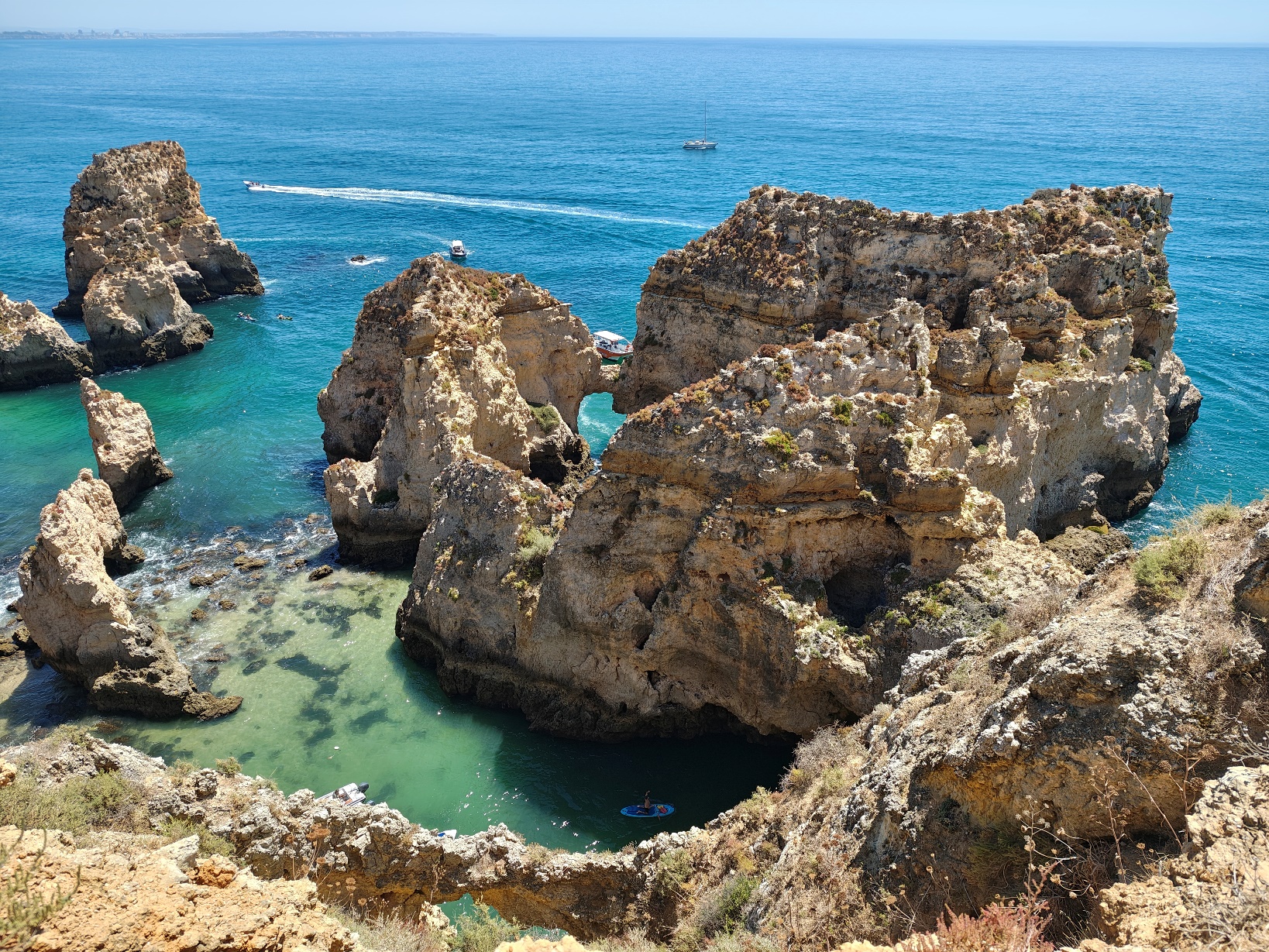 Ein absolutes Muss in Lagos ist die Ponta da Piedade, nur wenige Kilometer südlich des Zentrums. Die bizarren Felsformationen aus goldfarbenem Sandstein zählen zu den spektakulärsten Naturwundern der Algarve. Über Jahrtausende hat der Atlantik die weichen Gesteinsschichten ausgewaschen und dabei ein Labyrinth aus Klippen, Höhlen, Torbögen und Felstürmen geschaffen, die wie Skulpturen aus dem Meer ragen.
