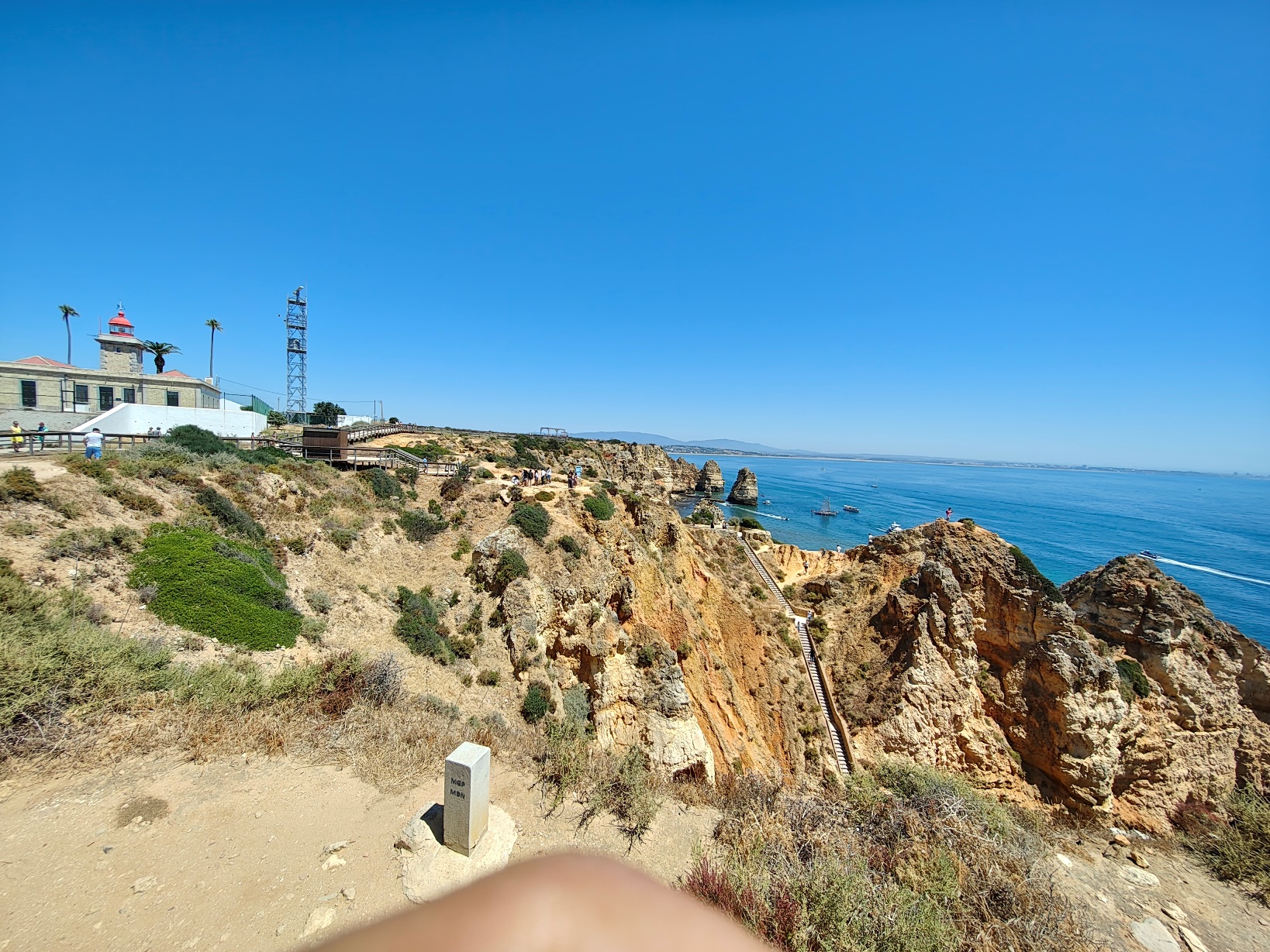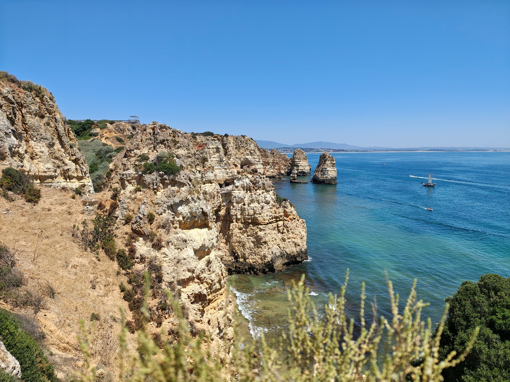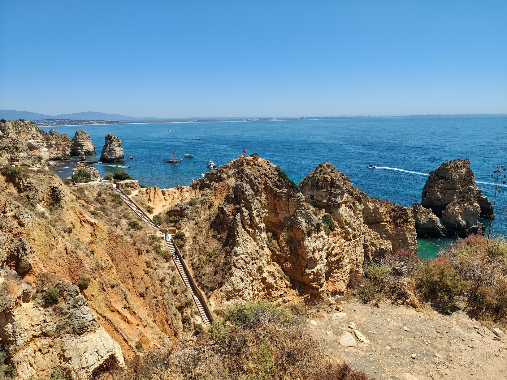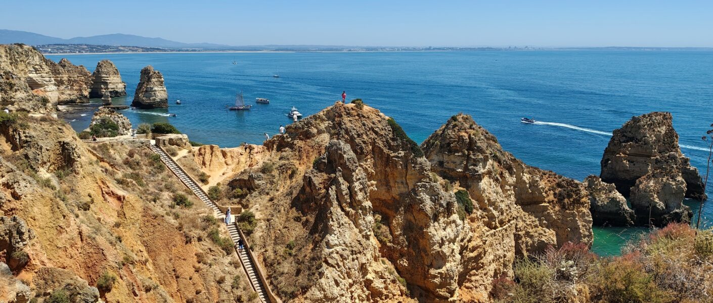 Vom Aussichtspunkt oben eröffnet sich ein grandioser Blick über die Küstenlinie, der an klaren Tagen bis nach Sagres reicht. Besonders beeindruckend ist das Farbspiel: das tiefe Blau des Ozeans, das warme Ocker und Gelb der Felsen und das strahlende Weiß der Gischt, die an den Klippen zerbricht. Mehrere Treppen und schmale Pfade führen hinab, sodass man die Formationen auch aus nächster Nähe bestaunen kann – die Perspektive von unten ist noch einmal eine ganz andere und macht deutlich, wie mächtig die Natur hier gewirkt hat.